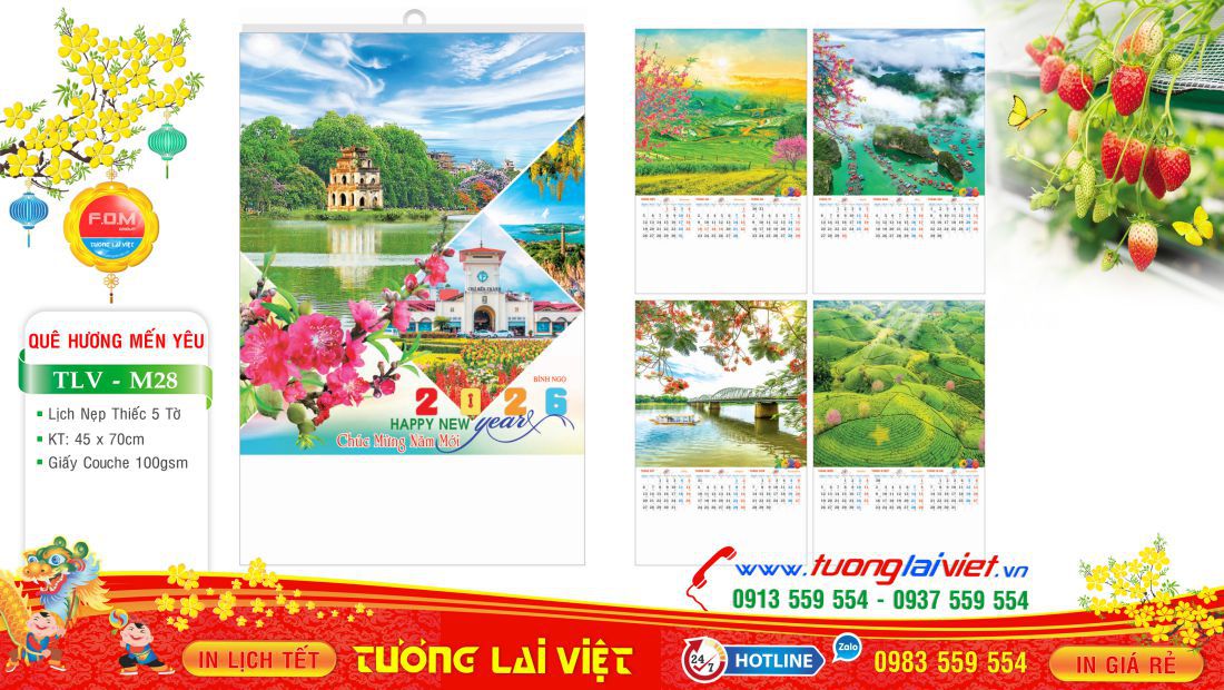 Lịch 5 tờ nẹp thiếc thường được in Offset 1 mặt trên giấy C105gsm, có kích thước: 36×70 và 45x70cm. Lịch 5 tờ Phong cảnh là mẫu lịch tờ treo tường giá rẻ nên được nhiều cửa hàng nhỏ lẻ chọn in lịch tết năm nay để làm quà tặng cuối năm cho khách hàng, bạn bè, đối tác và người thân nhân dịp năm mới.